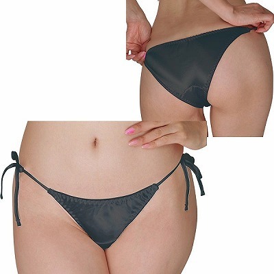 光沢感が美しいサテン生地の女性用フルバックショーツ。両サイドはセクシーな結びヒモ仕様で、結び目をパートナーに解かせる楽しみも!ブラックカラー