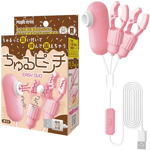 USB給電式の吸引&ニップルローターです♪挟む力を回して調整でき、吸引とピンチを同時に楽しめるダブルタイプです!12種類の振動モードを搭載し、ピンチ部分と吸引部にはシリコンカバーが付いているため、優しく包み込むような感触を提供♪本体重量76gと超軽量で、上下同時に使用しても快適です!モバイルバッテリーやUSBアダプターから給電でき、使用場所を選ばず楽しめる便利なアイテムです♪