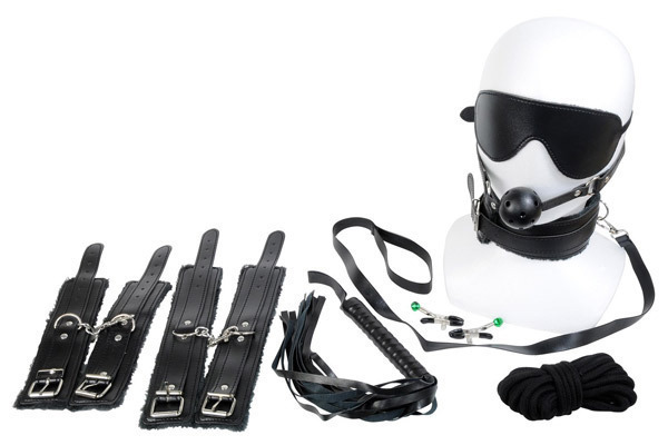 ●ブラックカラーの合皮製●内側は柔らかな起毛素材●リード付きの首枷ベルト●ベルト式の手枷&足枷●フィットするアイマスク●ボール付きのベルト口枷●鈴付き乳首クリップ×2●緊縛プレイ可能なロープ●スパンキング用バラ鞭。