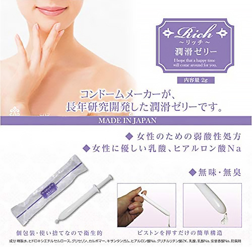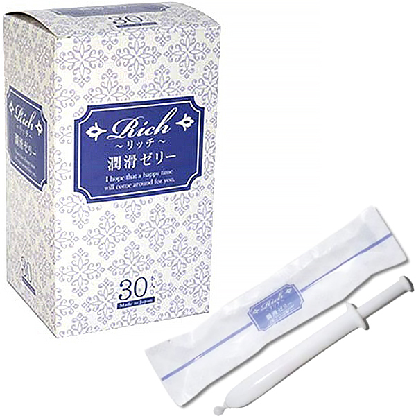 コンドームメーカーが長年研究開発した潤滑ゼリーです。潤い不足で悩む女性のために作った弱酸性処方で女性に優しい乳酸ヒアルロン酸Na。●急性毒性試験済みなので安心してお使いいただけます●無色透明・無味無臭の潤滑ゼリー●注射器型だからワンタッチで手を汚さず衛生的●ピストンを押すだけの簡単構造●個包装・使い捨てなので衛生的。30本入り