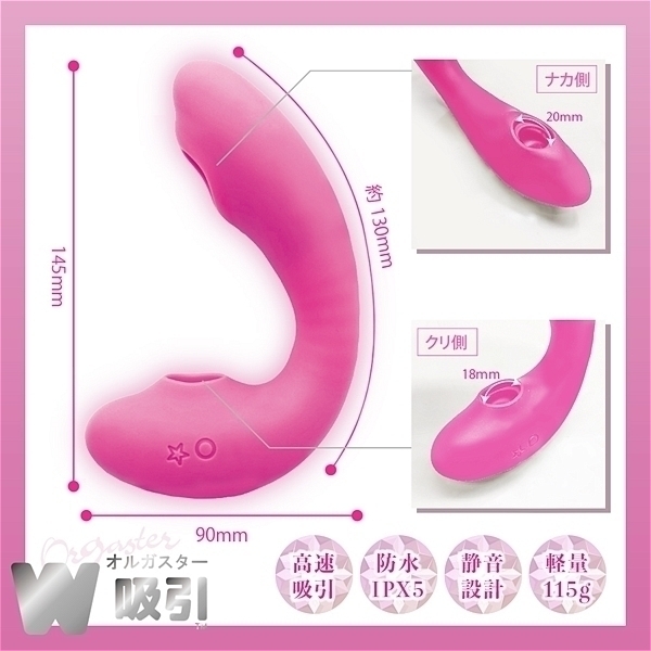 Wで吸う。新構造吸引システム−エアバルブ方式−でク●イキ・ナカイキ連続ゼッチョウの嵐を巻き起こす。USB充電式。軽量・静音設計、シリコン製の柔軟に曲がるフレキシブルネック。防水(IPX5)仕様でお手入れ簡単。●カラー:ピンク